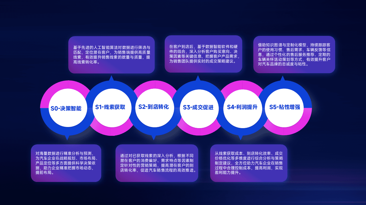 通过拓宽潜在客户来源、、优化线索分配并提高到店转化率,,,以增强销售效率。。同时,,,,利用线索数据不断优化分析模型,,有效提升转化率,,,扩大营销影响力。。。